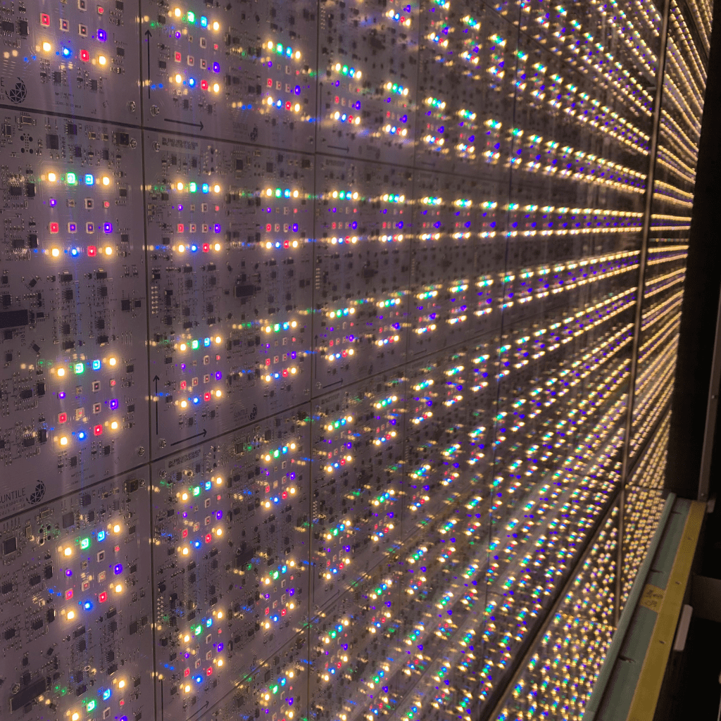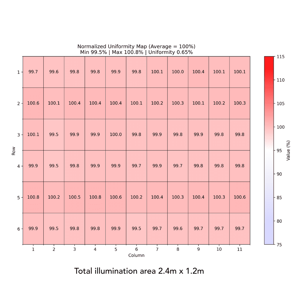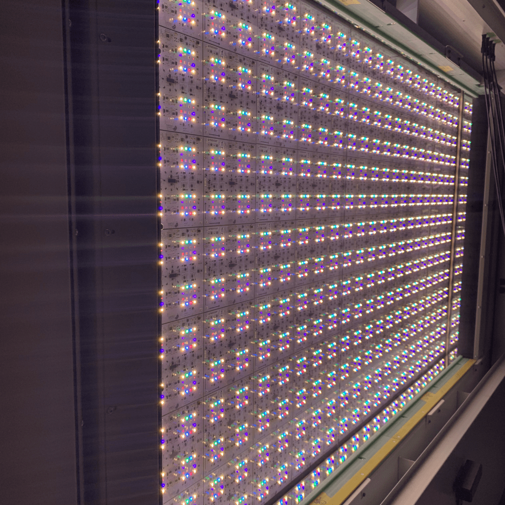 Configured illumination area — sized at build (e.g., 2.4 m × 1.4 m) and maintained at Class A+; tiles are individually serviceable for fast swaps